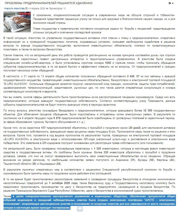 Напомним, что указом Президента Узбекистана от 03.04.2020г. №УП-5978 разрешено проведение годовых общих собраний акционеров по итогам 2019 года до 1 октября 2020 года, а также в режиме видеоконференцсвязи.