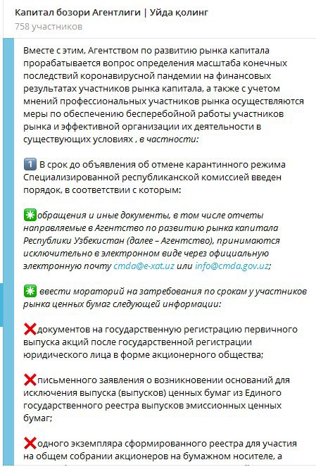 Также, #АРРК сообщает, что до объявления об отмене карантинного режима введён мораторий на затребование по срокам у участников рынка ценных бумаг: