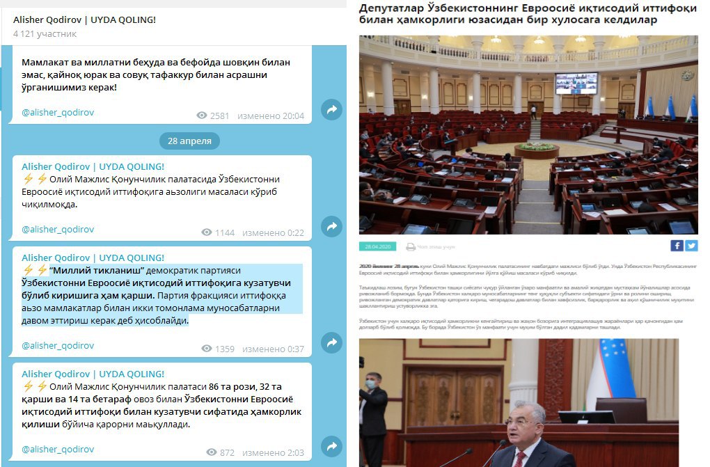 Об этом сообщили первыми несколько представителей Олий Мажлиса республики, в том числе замспикера Законодательной палаты, руководитель фракции партии "Миллий тикланиш" Алишер Кадиров на своём telegram- канале, отметив, что его партия против вступления в ЕАЭС даже в качестве наблюдателя