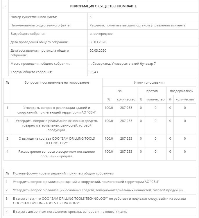 🤔 PS: На внеочередном ОСА от 17.12.2019г. (кворум ОСА-94,45%) в повестке дня стоял вопрос досрочного прекращения полномочий С.Ж. Рузиева, по которому большинством в 96,52% голосов было принято решение против. В результате С.Ж. Рузиев сохранил тогда за собой пост руководителя АО.