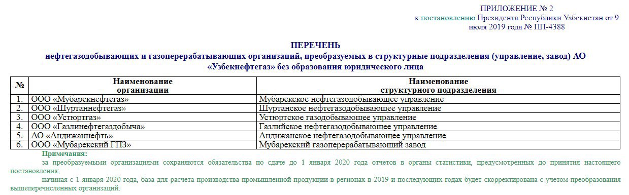 Напомним, что согласно постановлению Президента РУз. от 09.07.2019г. №ПП- 4388 АО «Андижаннефть» подлежит ликвидации путём преобразования в Андижанское нефтегазодобывающее управление #Узбекнефтегаз без образования юридического лица [