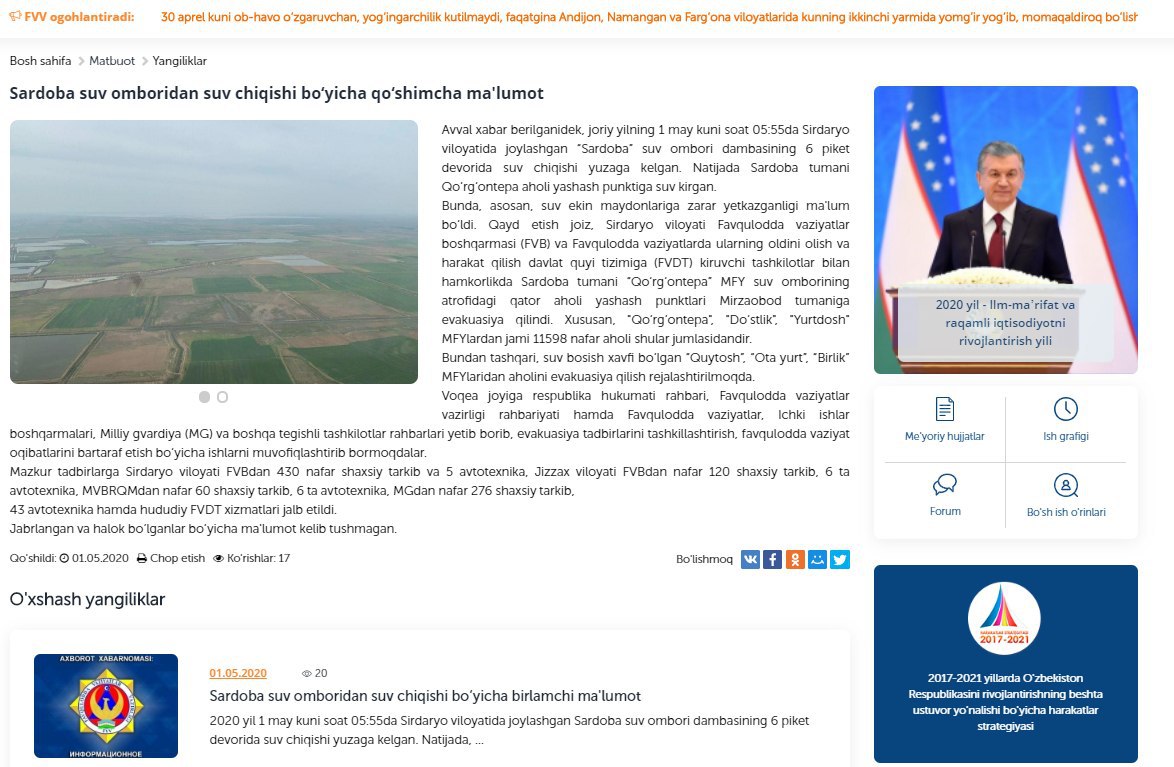 Почти 11,6 тысячи жителей махаллей «Кургантепа», «Дустлик» и «Юртдош» эвакуированы из своих домов из-за угрозы подтопления, вызванной прорывом дамбы Сардобинского водохранилища.