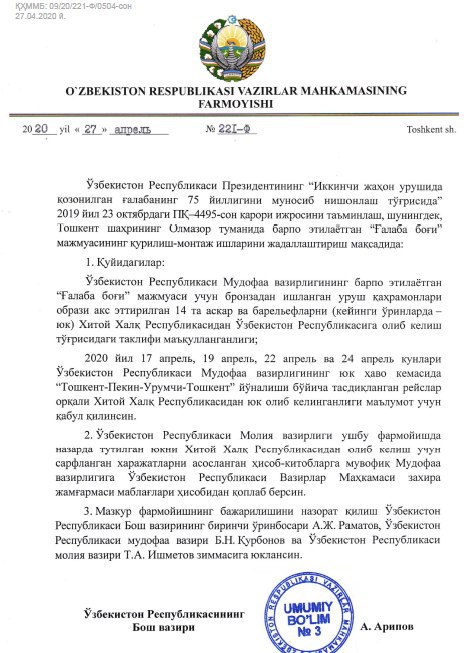 📜✍️ Данное поручение дано распоряжением КабМина от 27.04.2020г. №221-ф, согласно которому вышеуказанный груз доставлен рейсами на борту самолётов ВВС Узбекистана 17-24 апреля т.г.