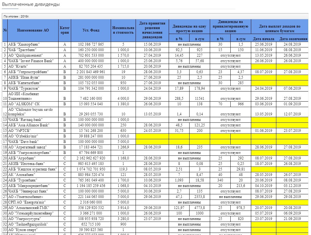 Республиканской фондовой биржей «Тошкент» проанализировано соблюдение листинговыми компаниями требований законодательства в части раскрытия информации, а также изучены данные по выплатам дивидендов акционерам.