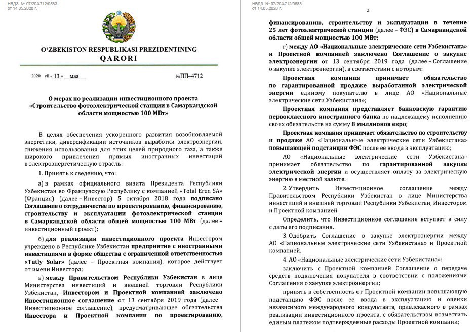 ➖утверждено Инвестсоглашение от 13.09.2019г. между Правительством в лице Мининвествнешторг и Французской компанией «Total Eren SA», а также учреждённым ею в Узбекистане ООО «Tutly Solar». При этом определено, что данное соглашение вступает в силу со дня его подписания;