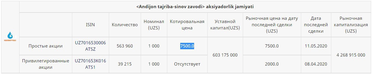 См на фото биржевые котировки на простые [ATSZ] и привил. [ATS1] акции АО «Andijon tajriba-sinov zavodi»