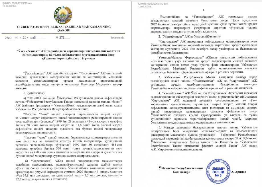 Данным постановлением Минфину поручено переоформить предоставленную Узнацбанку госгарантию по кредитным обязательствам АО «Узкимёсаноат» и АО «Фергана Азот», в связи с принятием предложения по пересмотру сроков, процентов и конвертации кредитной задолженности.