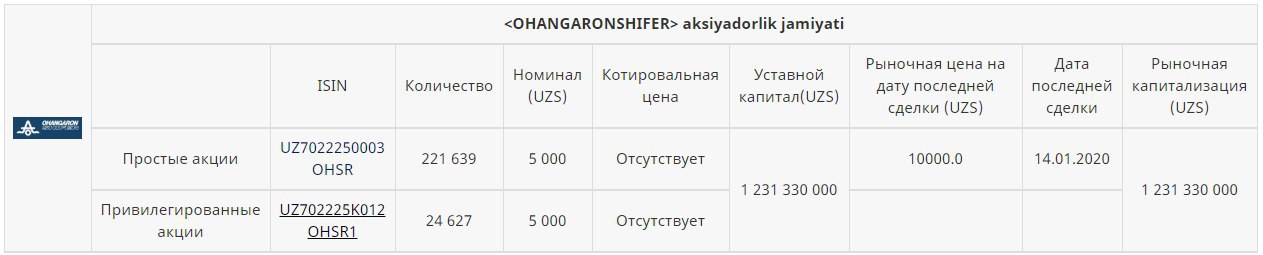 Напомним, что 21 апреля Ташкентское областное управление #АУГА объявило, что цена продажи госдоли в АО «Ахангараншифер» в размере 53,97% от уставного капитала АО снижена до 77,21 млрд. сум (на 40%). При этом цена одной акции [OHSR, OHSR1] равна 580 885,20 сум.