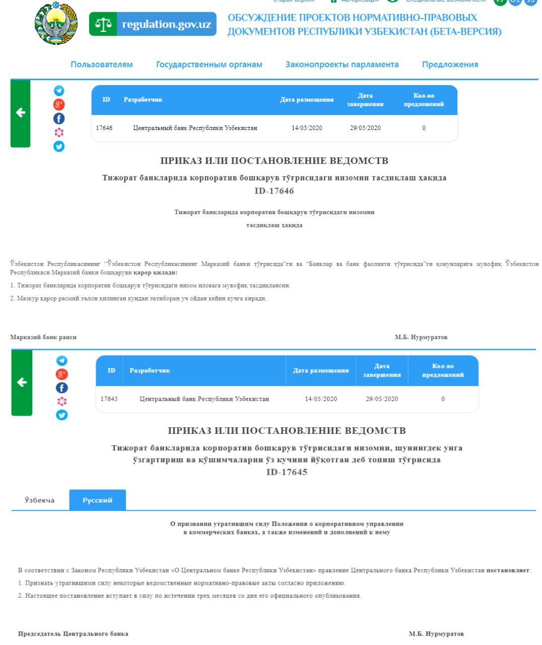 📜✍️ Постановлением Президента от 20.05.2020г. №ПП-4720 дано согласие на предложение о выделении из #ФРРУз дополнительно 100 млн. долларов в эквиваленте Агробанку ($40 млн.), Народному банку ($30 млн.) и Микрокредитбанку ($30 млн.).