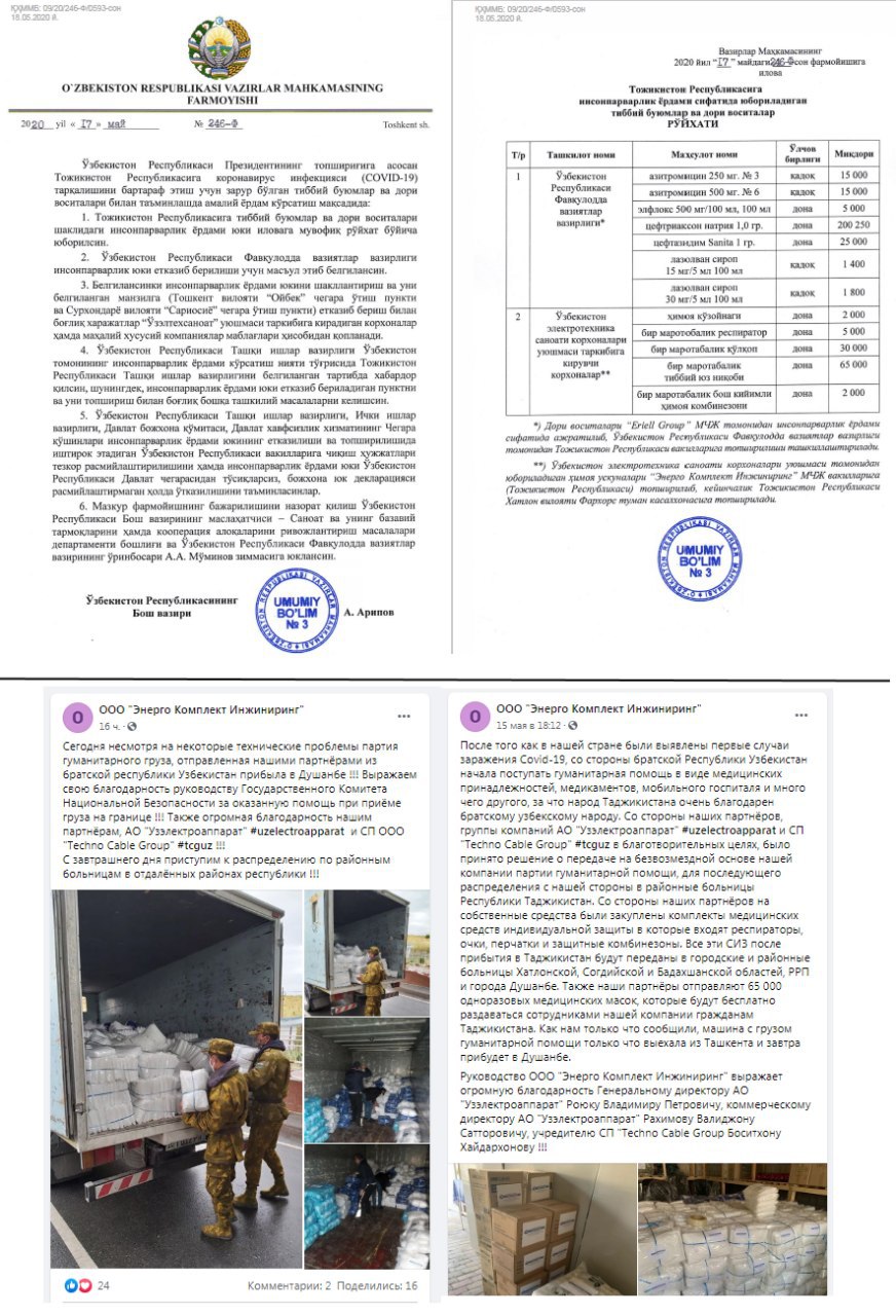 Как указано в приложении к распоряжению, ООО «Eriell Group» [#] выделит лекарственные средства и передаст МЧС Узбекистана для последующей передачи представителям Таджикистана. Защитные средства от предприятий Ассоциации «Узэлтехсаноат» будут переданы Таджикскому предприятию- ООО «Энерго Комплект Инжиринг» для последующей передачи в больницу Фархорского района Хатлонской области Таджикистана.