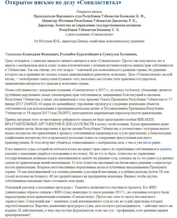 Источник: president.uzВыдержки из открытого письма Юсупова Ю.Б., директора Центра содействия экономическому развитию, адресованного председателю Верховного суда Камилову К.Ф., министру юстиции Давлетову Р.К.и директору АУГА Бекенову С. Х.