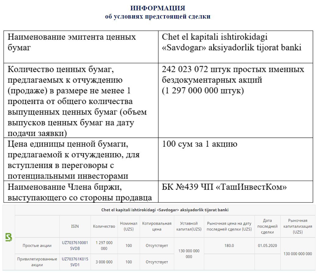 🏛 18,6% доли в Савдогарбанк выставляется на продажу за 24,2 млрд. сум