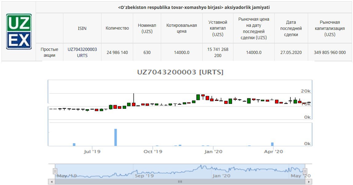 📈 Текущая биржевая котировка на простые акции УзРТСБ [URTS]: 14000 сум/шт при номинале 630 сум/шт.
