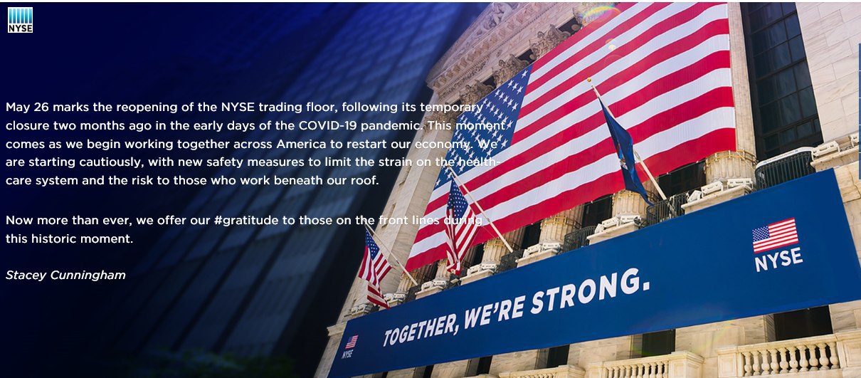 "Возобновление работы обернется появлением "новых норм" на Нью-Йоркской бирже и, возможно, послужит примером для других организаций, - отметила Стейси Каннингэм на страницах газеты The Wall Street Journal. - Мы приняли во внимание много факторов, и сейчас возникли условия для того, чтобы возобновить операции в условиях, когда мы предпринимаем общие усилия для восстановления американской экономики". При разработке плана возобновления работы операционного зала Нью-Йоркской биржи был учтён опыт, использованный при частичном возобновлении 4 мая работы торговой площадки в Сан-Франциско, где осуществляются операции с опционами.