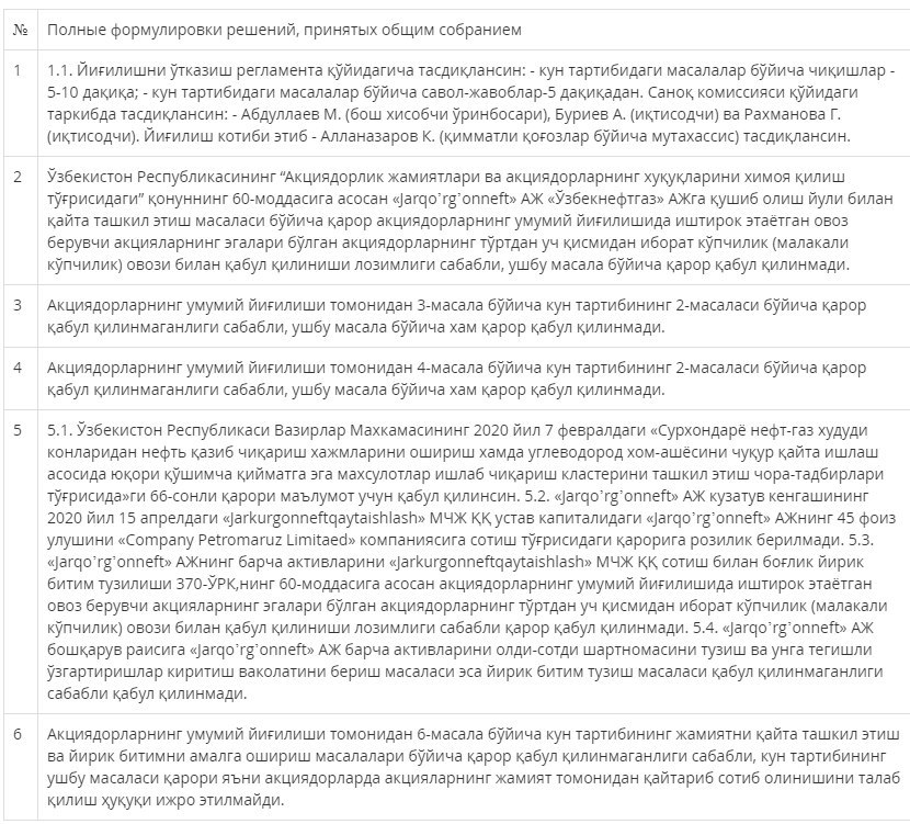 🤔 На собрании акционеров АО «Джаркурганнефть» по вопросам продажи всех активов АО, с присоединением АО к Узбекнефтегаз решения не приняты