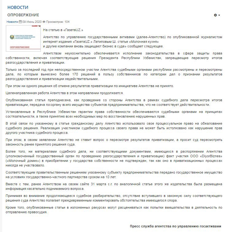 В ответ на опубликованную интернет изданием «ГазетaUZ.» статью «Молочная кухня» и другие компании вновь защищают бизнес в суде», Агентство по управлению госактивами сообщило, что им неукоснительно обеспечивается исполнение законодательства в сфере защиты права собственности, включая соответствующие решения Президента, запрещающие пересмотр итогов разгосударствления и приватизации.