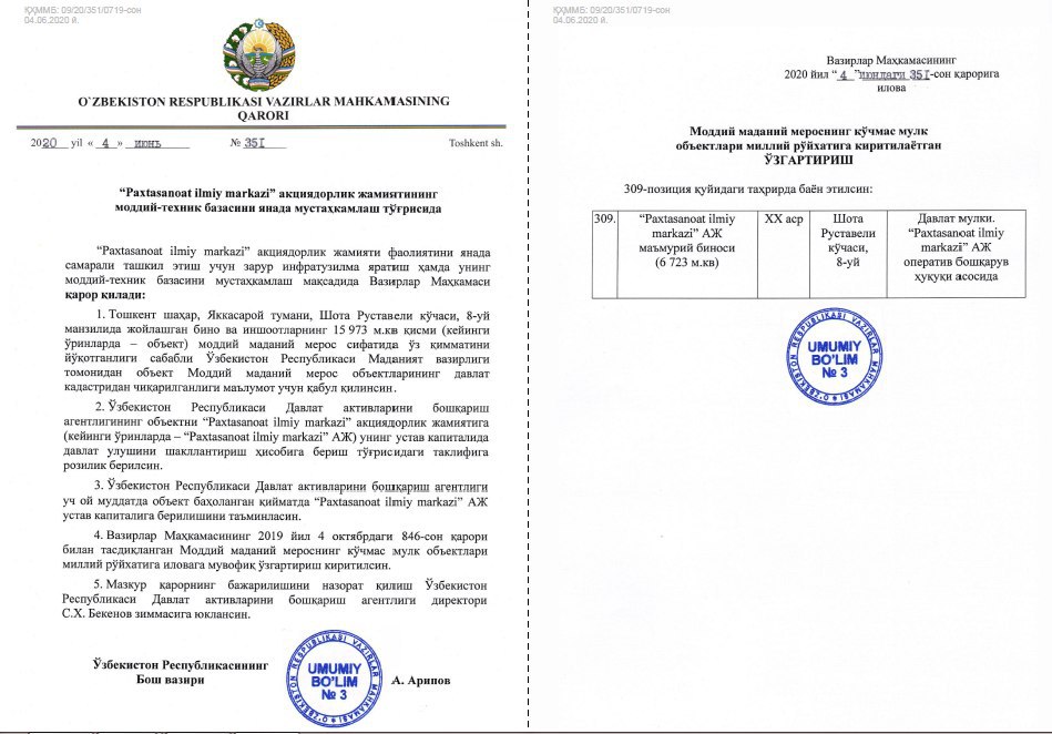 📜✍️ Согласно постановлению КабМина от 04.06.2020г. №351 в уставный капитал Акционерного общества «Paxtasanoat ilmiy markazi» передаётся часть здания и сооружений [15 973 кв м] по адресу г. Ташкент, Яккасарайский р-н, ул. Шота Руставели, 8 [на карте]. При этом, данный объект исключён из перечня объектов материального культурного наследия.