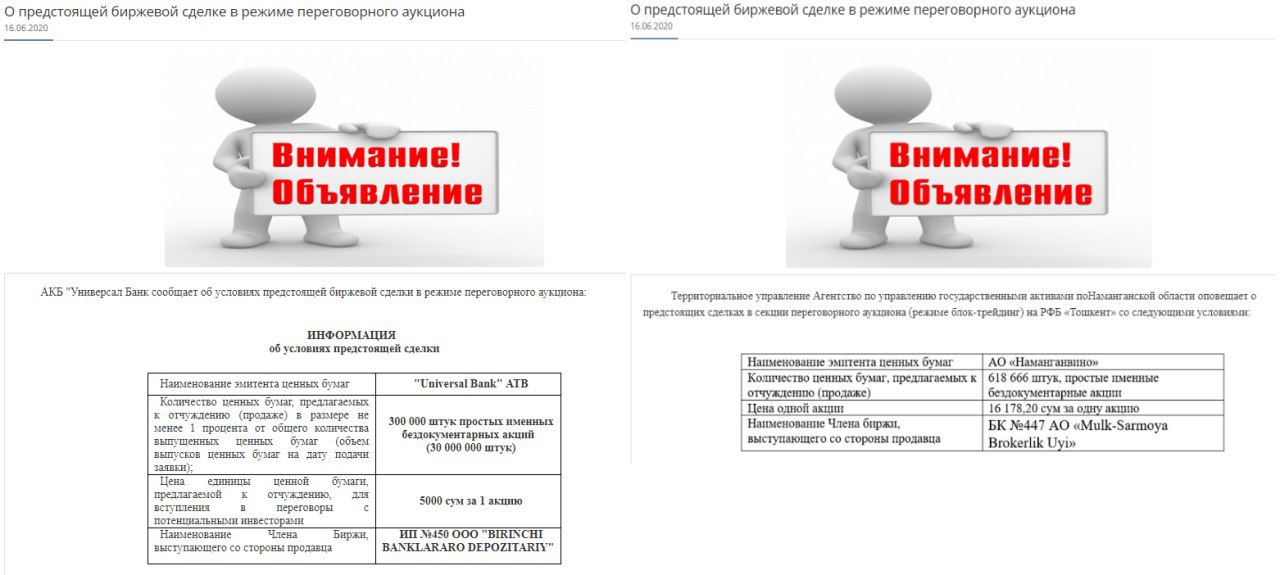 Кроме того, опубликованы объявления о предстоящих сделках по продаже пакета акций Универсалбанк [UNVB] (1% от уставного капитала за 1,5 млрд.сум) и госдоли в Наманганвино [NAVI] (57% от уставного капитала за 10,0 млрд. сум).