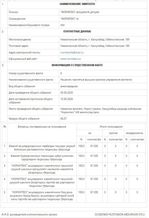 На внеочередном общем собрании акционеров АО «Norinteks», состоявшемся 05.06.2020г. (кворум ОСА - 65,07%), принято решение о преобразовании в ООО.