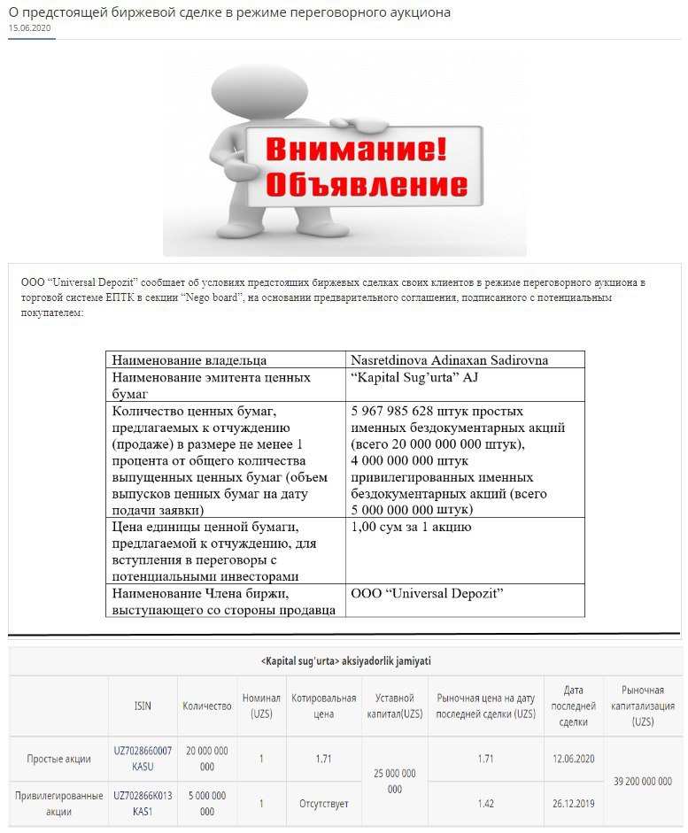 Соответствующее объявление опубликовано инвестпосредником [ООО “Universal Depozit”] сегодня на веб-сайте РФБ, согласно которому ожидается сделка в режиме переговорного аукциона по продаже Насретдиновой А.С. (по номинальной стоимости - 1 сум/шт):