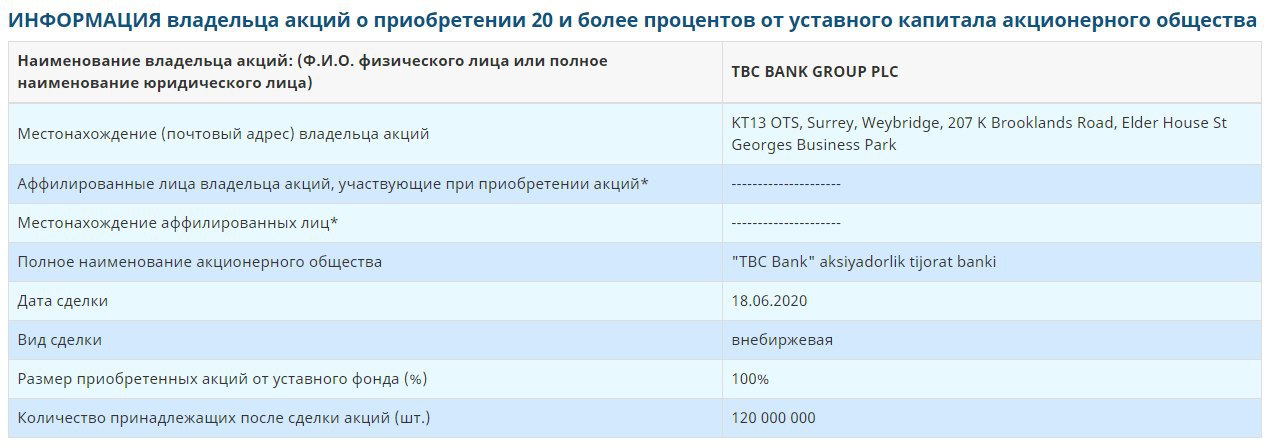 Напомним, что в конце мая был зарегистрирован первичный выпуск акций TBC банка [#] на 120 млрд. сумов, получившего 11 апреля 2020 года соответствующую лицензию #ЦБ.