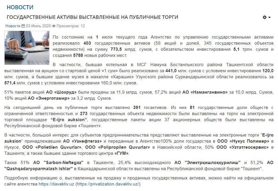 По состоянию на 1 июля 2020 года Агентством по управлению госактивами реализовано 403 госактивов (58 пакетов акций и долей в АО и ООО, 345 гособъектов недвижимости) на 773,5 млрд. сумов, с обязательством инвестирования 5,1 трлн. сумов и создания 5788 новых рабочих мест.