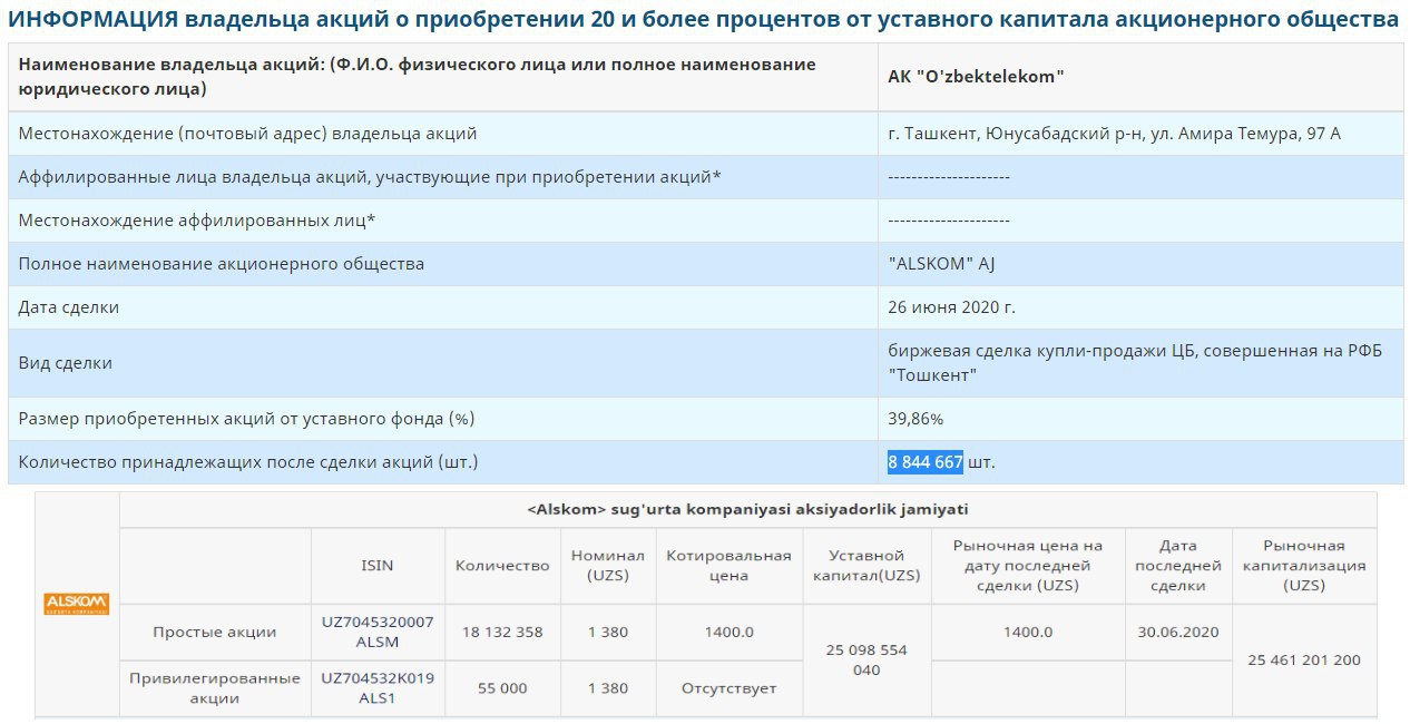 Государственная акционерная компания «Узбектелеком» 26 июня приобрела 39,8 % доли в Страховой компании «Alskom» за 10,15 млрд. сум