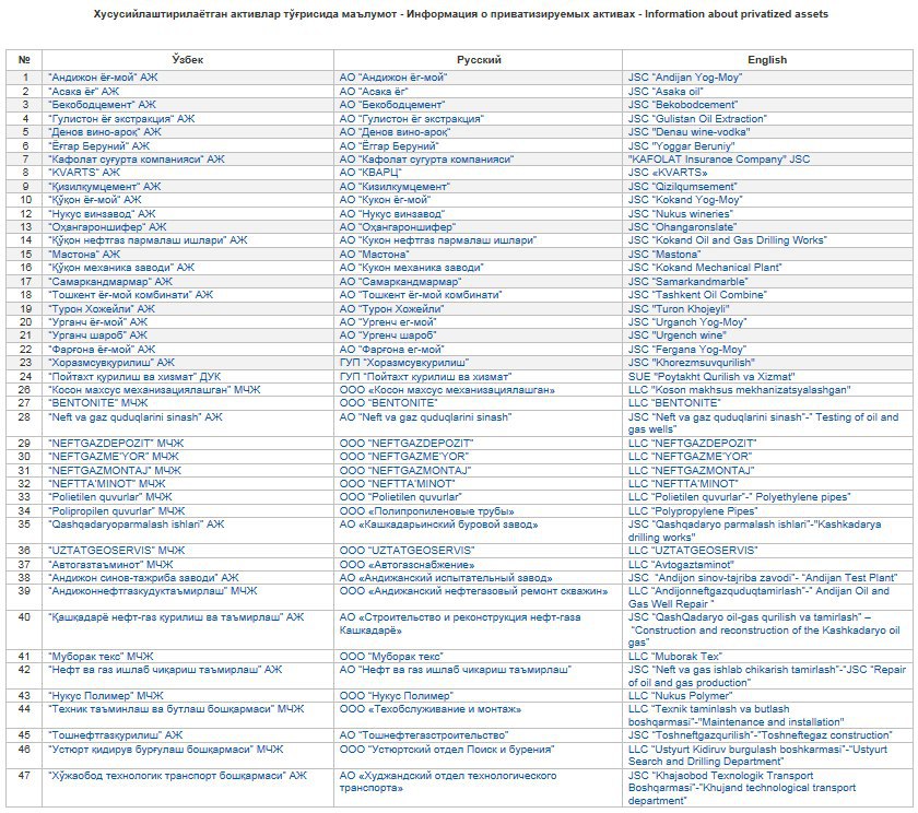 В частности, 51% доли в АО «Шохруд» были проданы за 11,9 млрд. сумов, 57,2% доли в АО «Наманганвино» за 10,0 млрд. сумов, 10% доли в АО «Энерготамир» за 3,2 млрд. сумов.