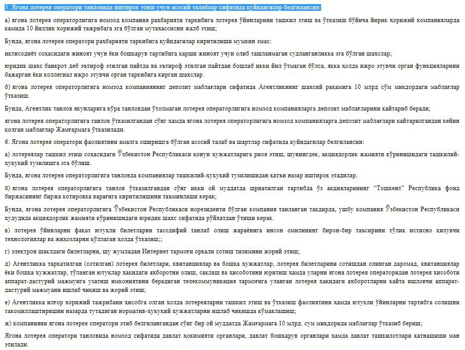 Проектом ПП предлагается установить ряд требований к кандидатам отбора Единого оператора лотерей, включая перечисление депозита на собственный счёт АРРК в размере 10 млрд. сум. Депозиты не прошедших отбор кандидатов возвращаются, а оставшаяся сумма направляется в вышеуказанный фонд при АРРК. При этом компания, ставшая Единым оператором лотерей, перечисляет в фонд при АРРК ещё 10 млрд. сум.