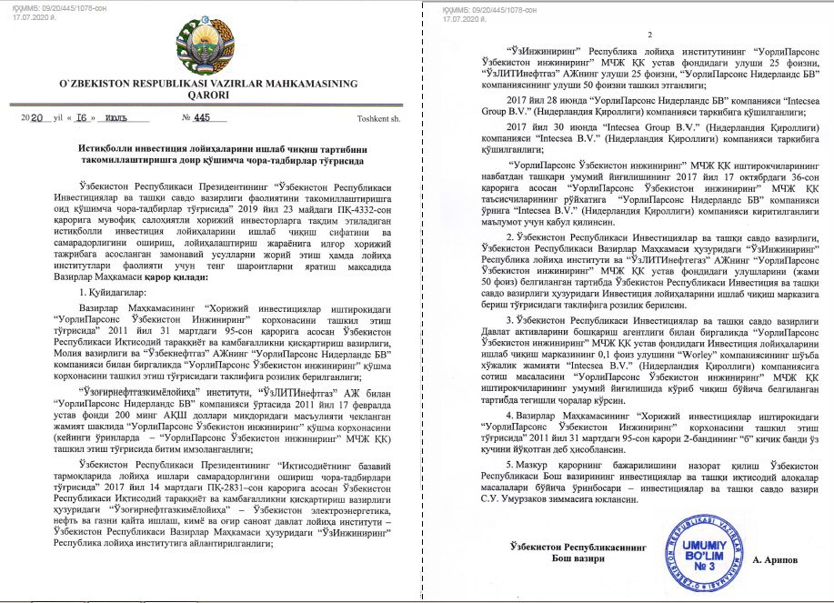 📜✍️ Постановлением КабМина от 16.07.2020г. №445 дано согласие на передачу Центру разработки инвестиционных проектов при Мининвествнешторг долей Акционерного общества «УзЛИТИнефтегаз» (25%) и Республиканского проектного института «УзИнжиниринг» при КабМине (25%) в уставном фонде СП ООО «WorleyParsons Uzbekistan Engineering». При этом в ПКМ не уточняется способ передачи долей в СП [безвозмездно, в счёт уменьшения уставного капитала или путём купли-продажи].