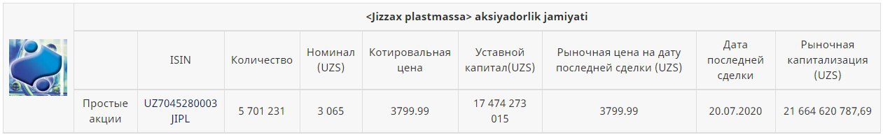 PS: АО «Джизак пластмасса» является листинговой компанией с декабря 2019 года в рамках завершившегося в марте т.г. #IPO с акциями АО [JIPL] [см также #].