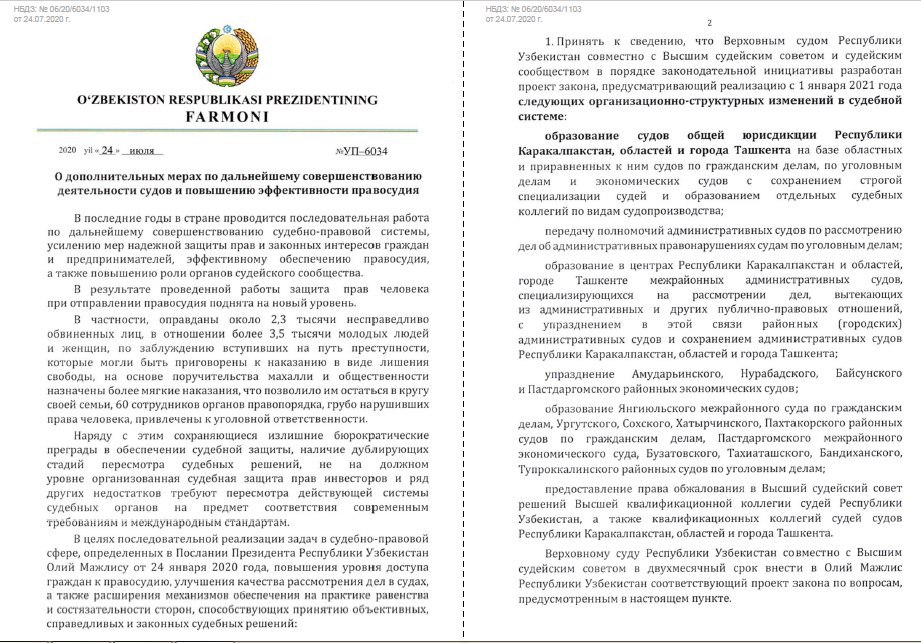 Кроме того, указом дано поручение Верховному суду Узбекистана совместно с Высшим судейским советом до 01.11.2020г. разработать и внести на рассмотрение парламента проекта закона «О судах» в новой редакции.