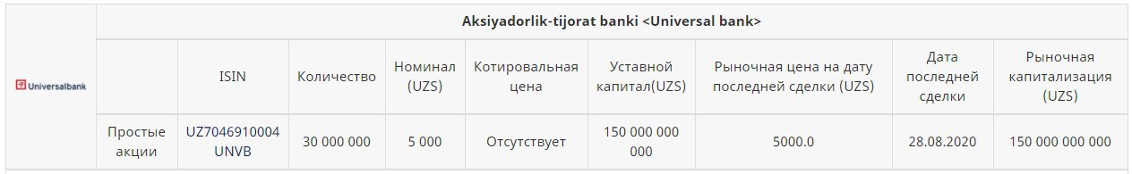 PS: По данным РФБ, последние крупные биржевые сделки с акциями Универсалбанка [UNVB] состоялись 28.08.2020г. В тот день зарегистрированы 2 сделки с акциями банка на 4,22 млрд.сум, прошедшие по номиналу акций (5000 сум/шт).