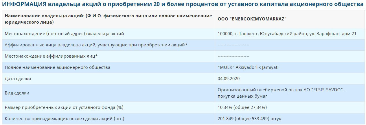 ООО «Energokimyomarkaz» приобрело на внебиржевом рынке 10,34% доли в АО «Mulk»