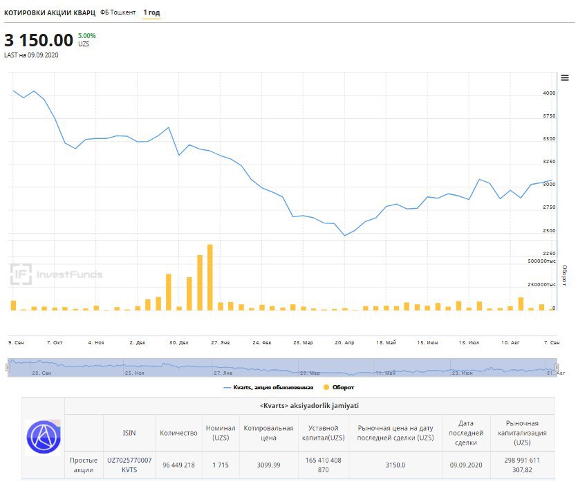 Tекущая биржевая котировка на акции #Кварц [KVTS] равна 3099,99 сум/шт при номинальной стоимости 1715 сум/шт.