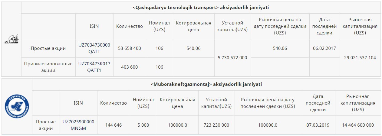 C 9 сентября к биржевым торгам вновь допущены акции АО «Qashqadaryo texnologik transport» [QATT, QATT1] и АО «Мубаракнефтегазмонтаж» [MNGM].