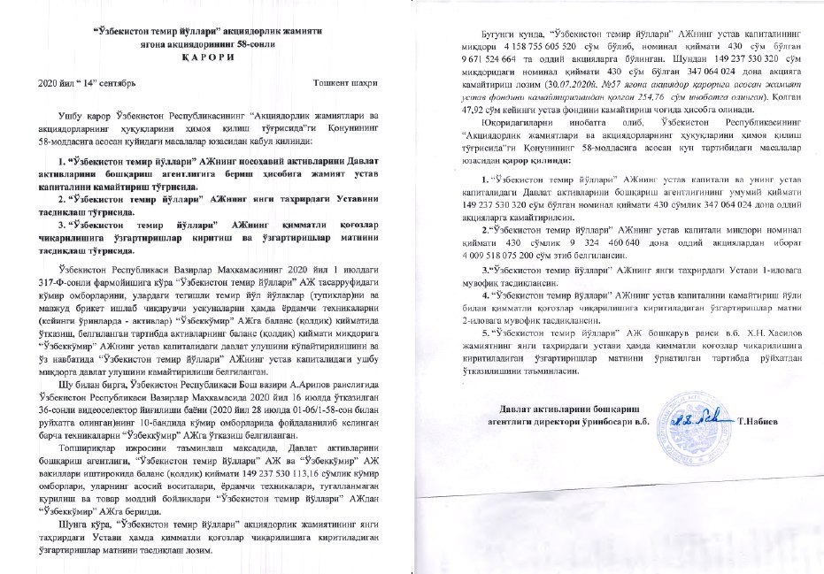 Сегодня акционером государственного АО «Ўзбекистон темир йўллари» принято решение уменьшить уставный капитал #ГАЖК на 149,23 млрд. сум [до 4,009 трлн. сум] в связи с передачей Акционерному обществу «#Узбекуголь» в счёт увеличения госдоли складов, ЖД веток, станков для производства угольных брикетов и вспомогательной техники, а также иных соответствующих ТМЦ по балансовой (остаточной) стоимости.