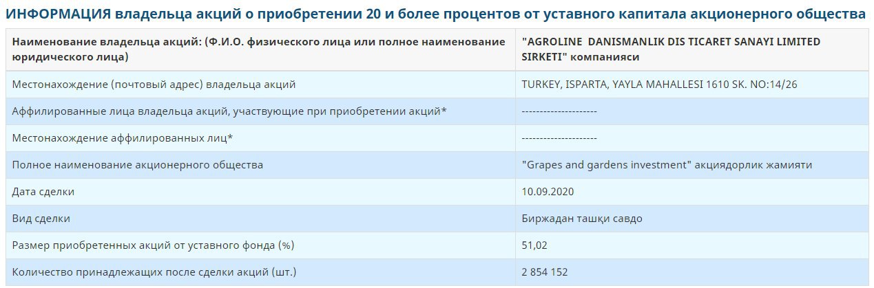 Турецкая компания «Agroline Danismanlik Dis Ticaret Sanayi Limited Sirketi» приобрела 51,02 % доли в уставном капитале Акционерного общества «Grapes and gardens investment» .