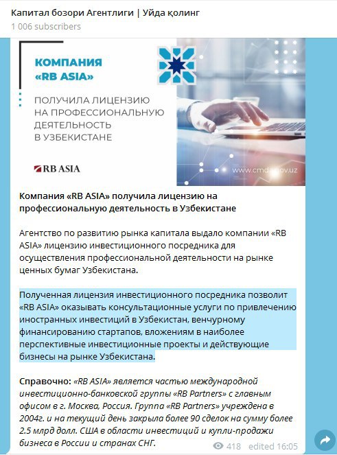 Как сообщает #АРРК, получение данной лицензии позволит ООО «RB Asia» оказывать консультационные услуги по привлечению иностранных инвестиций в Узбекистан, венчурному финансированию стартапов, вложениям в наиболее перспективные инвестпроекты и действующие бизнесы на рынке Узбекистана.