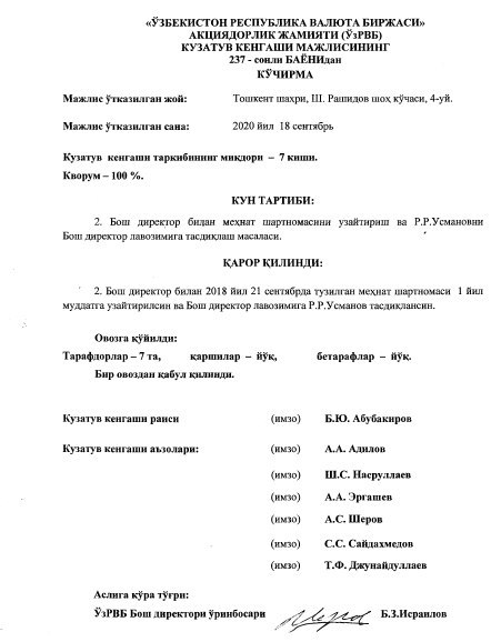 PS: Рашид Усманов возглавил биржу в конце июля 2018 года после того как на годовом ОСА от 23.07.2018г. акционеры биржи единогласно проголосовали против продления полномочий Бекмирзаева Навруза Бурхановича в должности гендиректора.