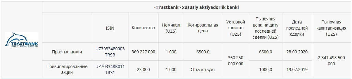 На внеочередном общем собрании акционеров Трастбанка, состоявшемся 25.09.2020г. (кворум ОСА – 74,90%), нераспределенная прибыль прошлых лет в размере 119,74 млрд. сум и чистая прибыль банка по итогам I полугодия 2020 года в размере 108,63 млрд. сум [всего 228,38 млрд. сум] направлены на выплату дивидендов по простым акциям из расчета 101,4% или 1 014 сум на одну простую акцию.
