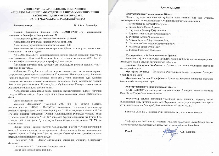 На годовом общем собрании акционеров АО «Дори-дармон», состоявшемся 17.09.2020г. (кворум ОСА – 73,15%), принято к сведению, что убыток АО по итогам 2019 года составил 48,34 млрд. сум.