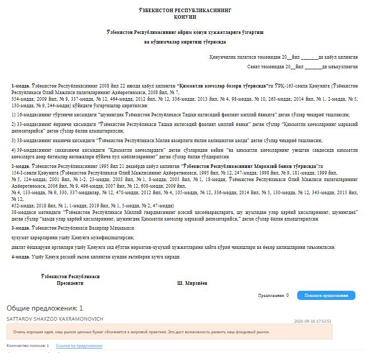 Агентство по управлению госактивами опубликовало проект изменений и дополнений в законы «О рынке ценных бумаг» [ЗРУ-387 от 03.06.2015г., далее - Закон] и «О Центральном банке Республики Узбекистан» [ЗРУ-582 от 11.11.2019г.].