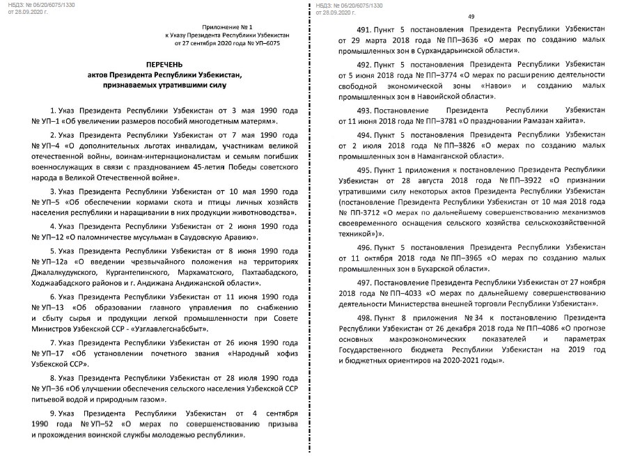 📜✍🏼 Согласно указу Президента Узбекистана от 27.09.2020г. №УП-6075, по итогам проведённой Минюстом инвентаризации выявлены около 2,5 тыс. устаревших и утративших актуальность действующих нормативно-правовых актов (НПА), приводящих к излишнему регуляторному бремени, бюрократическим преградам и препонам, коллизиям в правоприменительной практике. При этом данным указом признаны утратившими силу полностью либо частично 498 указов и постановлений Президента Узбекистана.