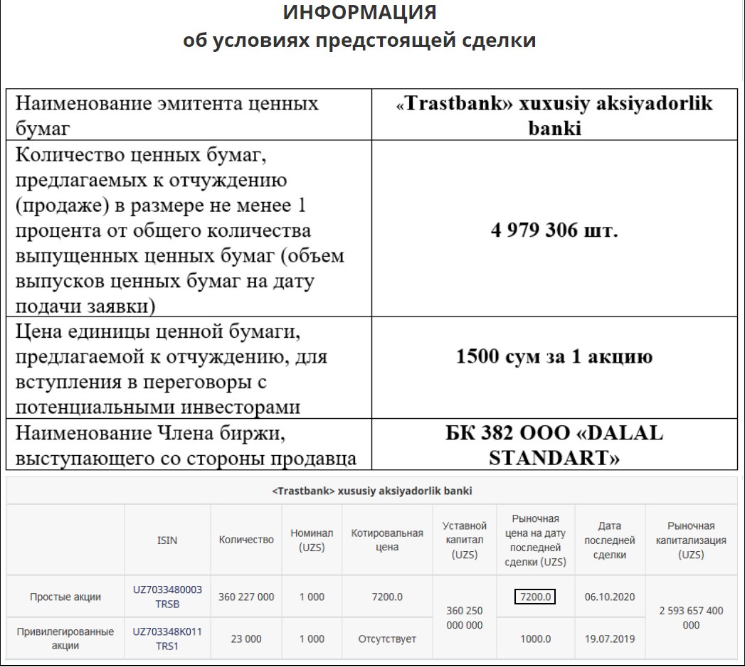 Согласно объявлению, предлагаемая цена за акцию – 1500 сум/шт при номинальной стоимости 1000 сум/шт, и котировальной цене простой акции [TRSB] 7200 сум/шт.