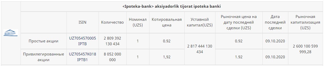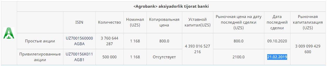 PS: Агробанк находится в биржевом листинге с сентября 2003 года. Простые [AGBA] и привил. [AGB1] акции банка допущены к торгам на РФБ. При этом биржевая котировка простых акций Агробанка равна 800 сум/шт при номинале 1168 сум/шт.