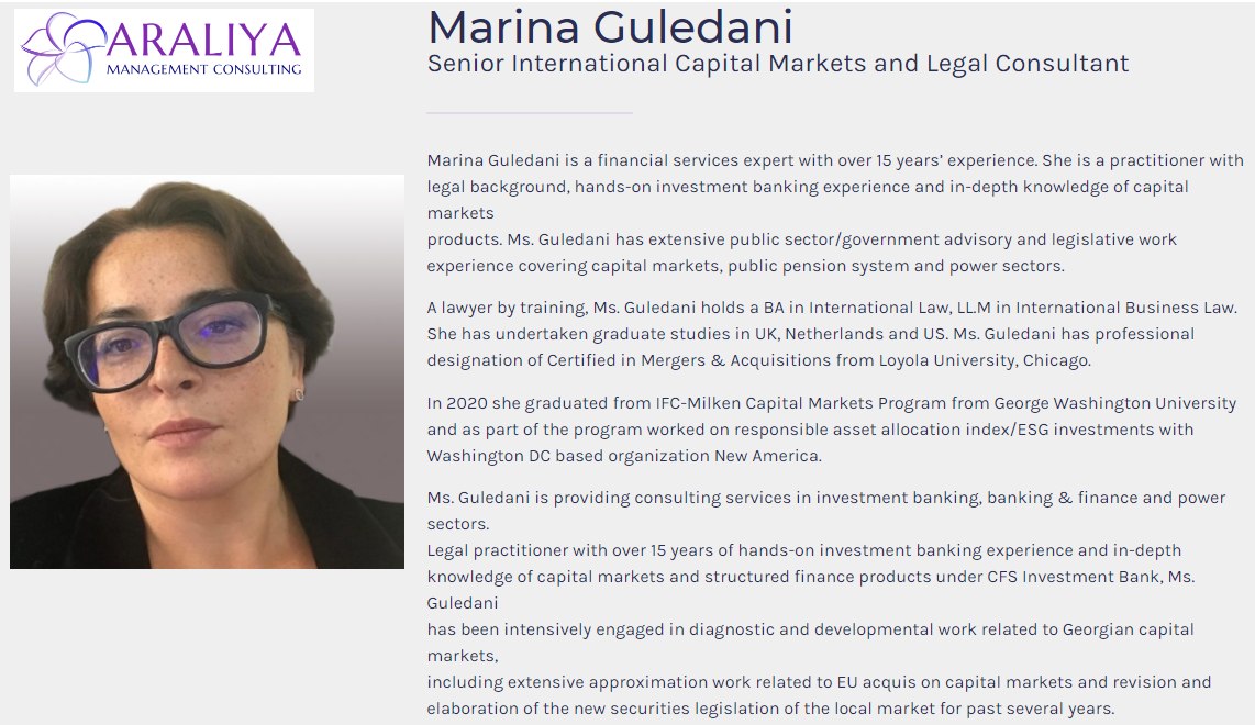 Марина Гуледани, cтарший консультант по международным рынкам капитала румынской фирмы «Araliya Management Consulting», привлечена, при поддержке #ЕБРР, для оказания содействия #АРРК в разработке проектов законов «О рынке капитала» и «О регуляторе рынка капитала».