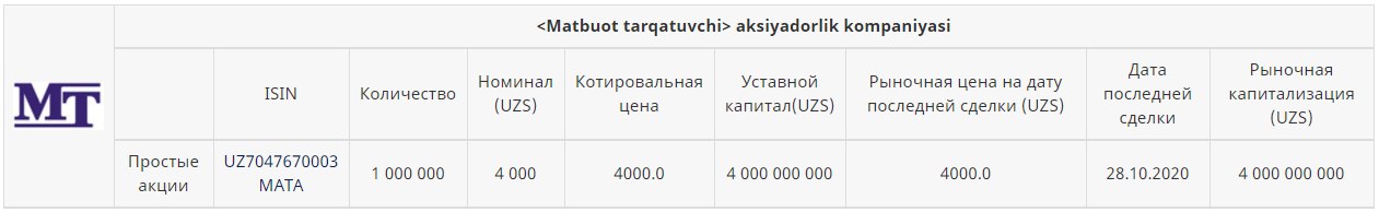 PS: Акции АО [MATA], с целью продажи госдоли (26%) были допущены к обращению на РФБ в марте 2020 года в категории «P» после их делистинга в марте 2019 года. 21 сентября т.г. было объявлено, что цена выставленного в марте на продажу госпакета акций АО снижена на 50% (с 9,30 млрд. сум до 4,65 млрд. сум).