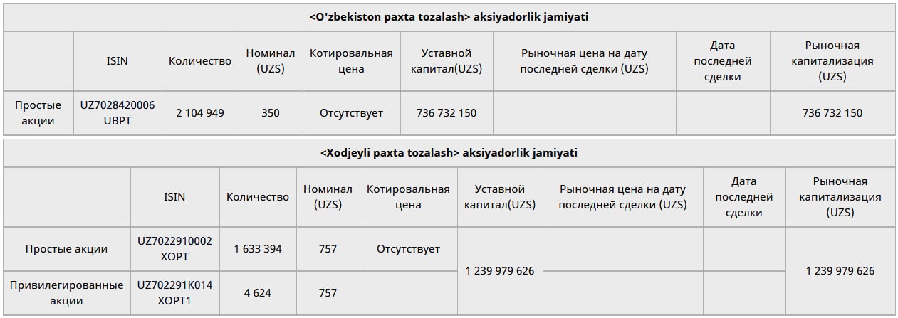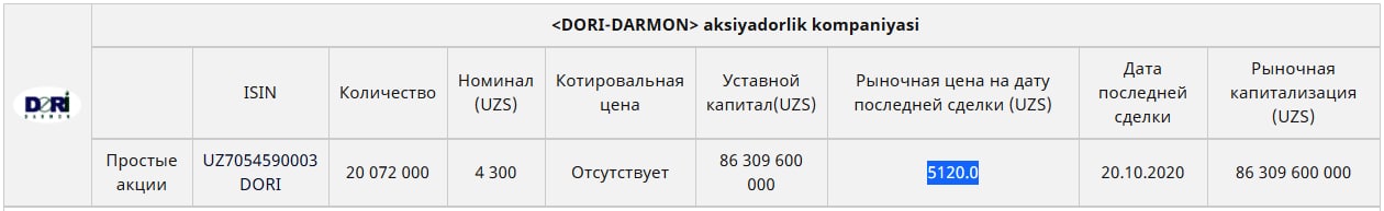 PS: Делистинг акций АО был в январе 2019 года. По данным ElSys-Savdo, последняя сделка с акциями АО на внебиржевой торговой площадке прошла 09.10.2019г. Тогда 29239 шт. акций АО были проданы за 415,63 млн. сум (14215 сум/шт). См также #