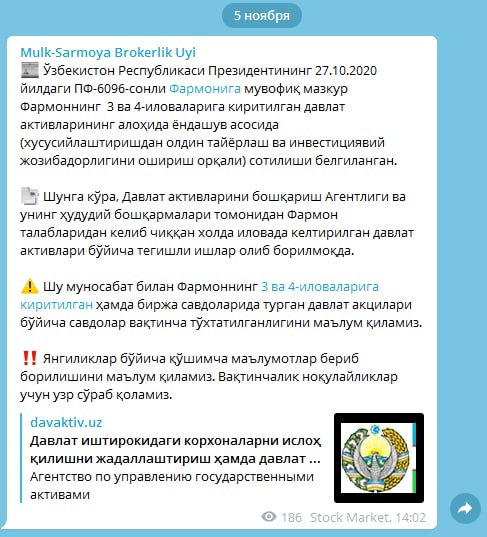 АО «Mulk-Sarmoya Brokerlik Uyi», являющееся брокером от имени государства объявило, что временно приостановлена продажа госпакетов акций АО, выставленных на биржу и включённых в приложения №3 и №4 к указу Президента от 27.10.2020г. №УП-6096 «О мерах по ускоренному реформированию предприятий с участием государства и приватизации государственных активов».